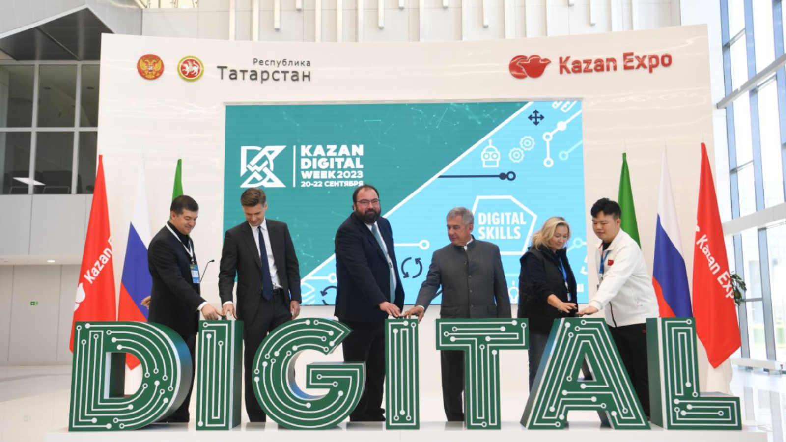Сегодня 20 сентября на площадке «Казань Экспо» состоялось открытие международного форума Kazan Digital Week-2023 и V отраслевого чемпионата в сфере цифровых технологий DigitalSkills-2023. в церемонии приняли участие Раис Татарстана Рустам Минниханов, министр цифрового развития, связи и массовых коммуникаций РФ Максут Шадаев, заместитель министра транспорта РФ Дмитрий Баканов, генеральный директор Агентства развития профессий и навыков Роберт Уразов.